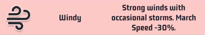 All march speed is reduced by 30%. This impacts all travelling on the map and could cause a garrison or rallied attack to fail so be sure to look into your timing windows when traveling in windy weather.
